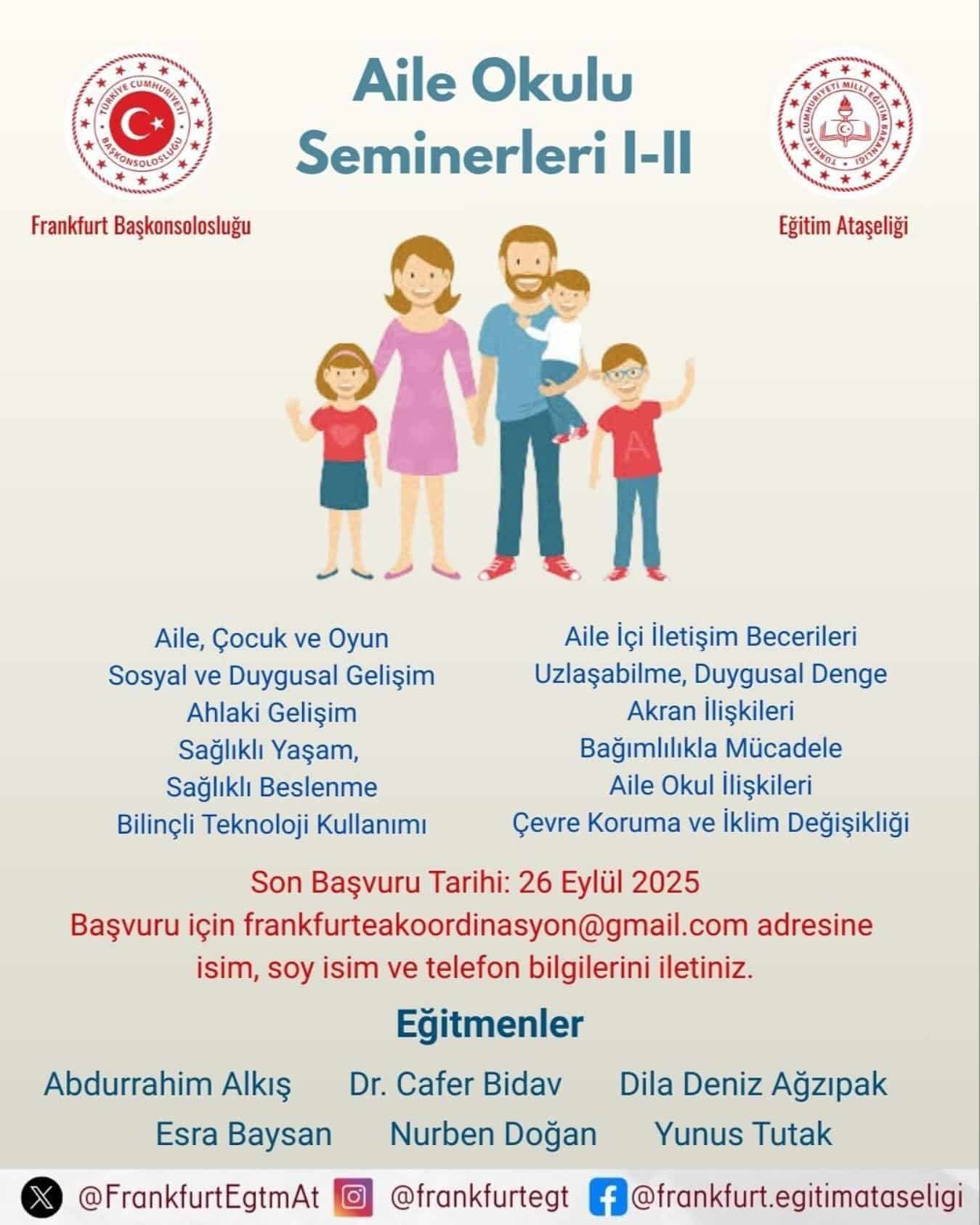 FRANKFURT'TA AİLE OKULU SEMİNERLERİ BAŞLIYOR! Frankfurt Başkonsolosluğu Eğitim Ataşeliği tarafından düzenlenen Aile Okulu Seminerleri I-II, siz değerli ailelerimizi bekliyor. Aile, Çocuk ve Oyun Aile İçi İletişim Becerileri Bilinçli Teknoloji Kullanımı ve daha birçok önemli konuda seminerler sizlerle olacak! Kurslarımız tamamen ÜCRETSİZdir. Program sonunda resmî, sertifikalı bir eğitim tamamlamış olacak ve sertifikalarınızı düzenlenecek törenle teslim alacaksınız. Dersler, başvurulara göre online ya da yüz yüze yapılabilecektir. Son Başvuru Tarihi: 26 Eylül 2025 Başvuru için: frankfurteakoordinasyon@gmail.com (Ad, soyad ve telefon bilgilerinizi iletmeniz yeterlidir.) Yer: Frankfurt Türk Kültür Merkezi Aile bağlarını güçlendirmek, çocuk gelişiminde doğru adımlar atmak ve sağlıklı bir iletişim kültürü oluşturmak isteyen herkesi bekliyoruz!