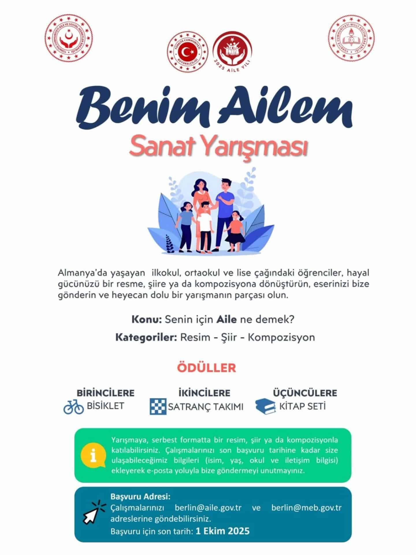 T.C. Aile ve Sosyal Hizmetler Bakanlığı ile T.C. Millî Eğitim Bakanlığı Berlin Eğitim Müşavirliği iş birliğinde düzenlenen "Benim Ailem" Sanat Yarışması başvuruları devam etmektedir. Almanya'da yaşayan ilkokul, ortaokul ve lise çağındaki öğrencilerimizin katılımına açık olan yarışmamızda öğrencilerimiz, aile kavramını resim, şiir veya kompozisyon yoluyla ifade etme fırsatı bulacaklardır. Konu: Senin için aile ne demek? Kategoriler: Resim – Şiir – Kompozisyon Ödüller: · Birincilere: Bisiklet · İkincilere: Satranç Takımı · Üçüncülere: Kitap Seti Başvuru adresi: berlin@aile.gov.tr – berlin@meb.gov.tr Son Başvuru Tarihi: 1 Ekim 2025