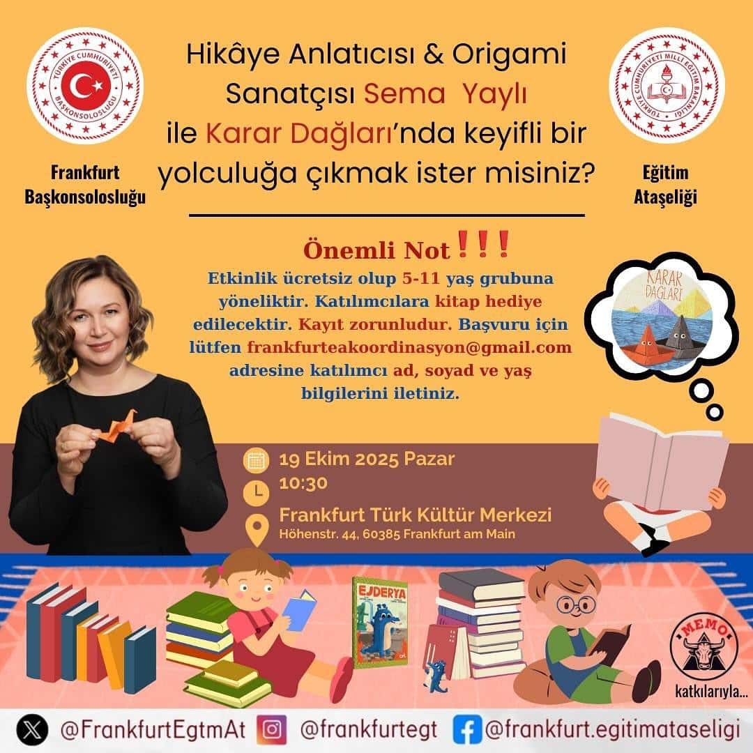 Hikâye ve origami ile eğlenceli bir yolculuğa hazır mısınız? Hikâye Anlatıcısı & Origami Sanatçısı Sema Yaylı ile Karar Dağları kitabı eşliğinde keyifli bir serüvene davetlisiniz! Etkinlik 5–11 yaş grubu çocuklara yöneliktir. Katılım ücretsiz olup, çocuklara kitap hediye edilecektir. Kayıt zorunludur. Başvuru için: frankfurteakoordinasyon@gmail.com (Çocuğunuzun ad, soyad ve yaş bilgilerini iletiniz.) Tarih: 19 Ekim 2025, Pazar Saat: 10:30 Yer: Frankfurt Türk Kültür Merkezi – Höhenstr. 44, 60385 Frankfurt am Main